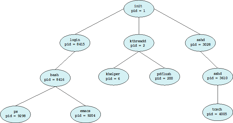 - Parent process는 children processes를 만든다. 즉, 다른 프로세스를 만들어서, 프로세스 트리를 형성한다.